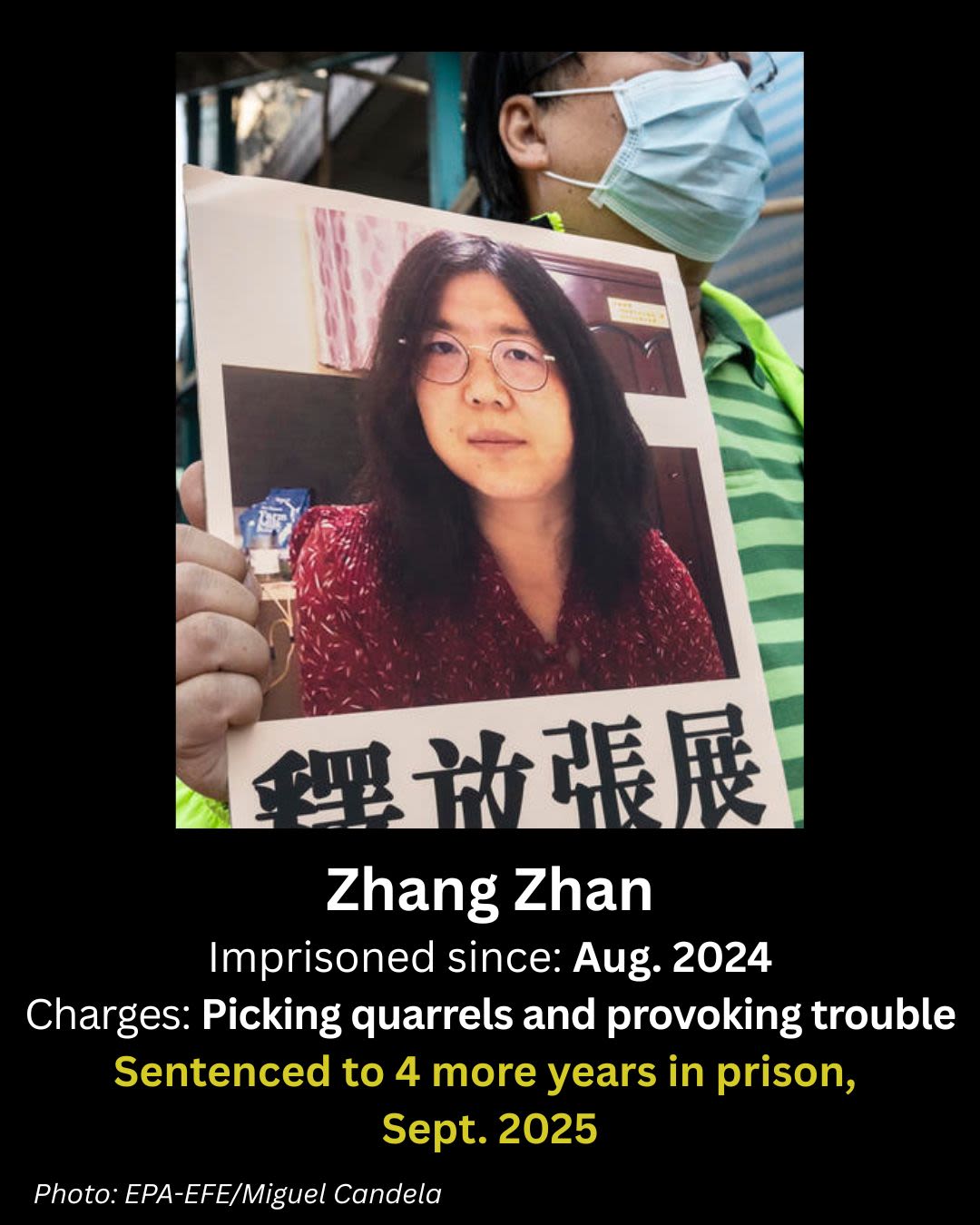 Zhang Zhan, a citizen journalist, first rose to the attention of authorities for her reporting on the Covid-19 outbreak in Wuhan. She was first arrested in May 2020 and charged with “picking quarrels and provoking trouble,” charges commonly used by the government to crack down on activists, journalists and anyone who dared to criticize the CCP. Later that year, she was sentenced to four years in prison.