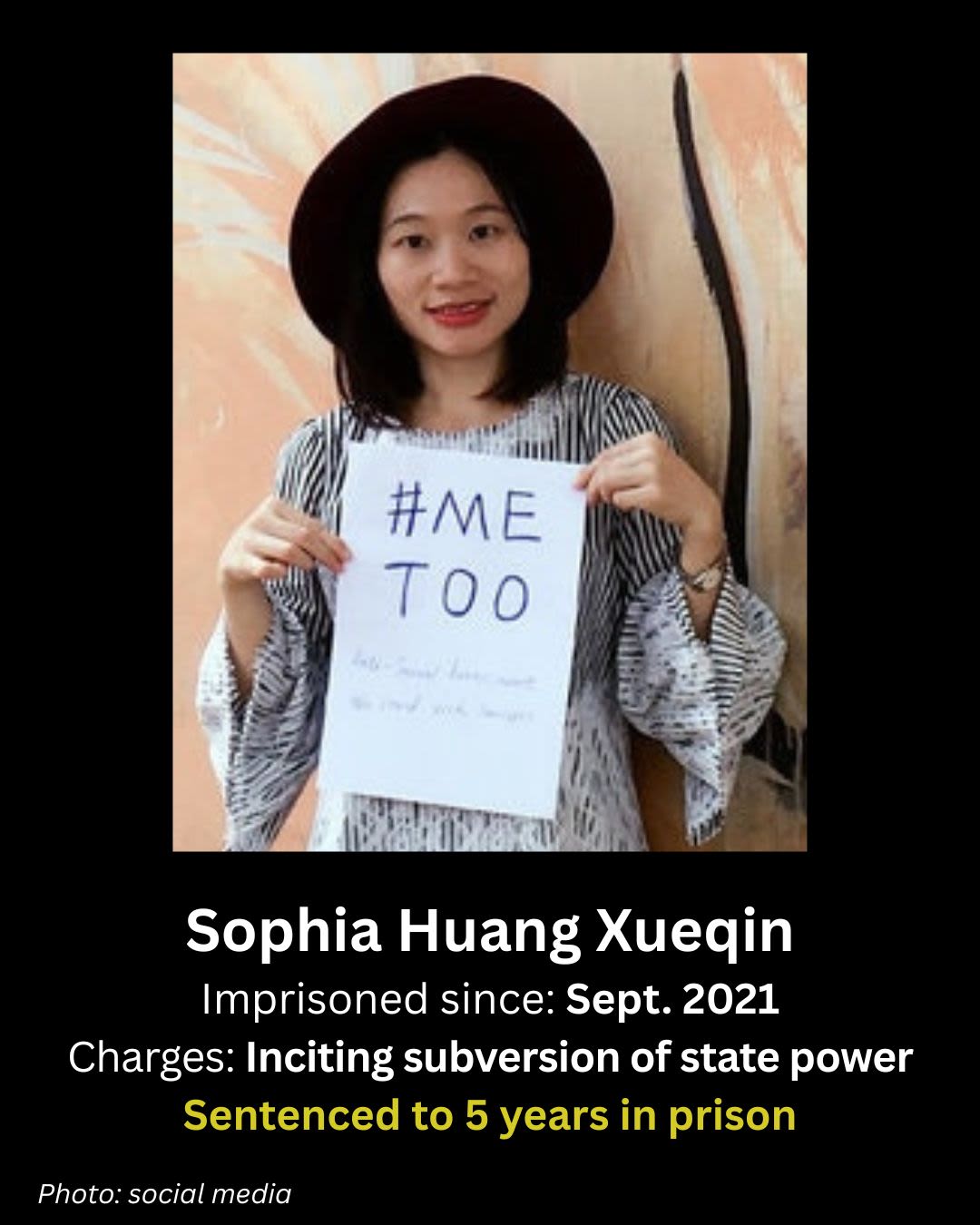 Sophia Huang Xueqin is an award-winning independent investigative journalist known for bringing the #MeToo movement to China through her reporting on sexual harassment at universities and in the workplace. She was arrested in September 2021 and charged with inciting subversion of state power. In June 2024, she was sentenced to five years in prison.